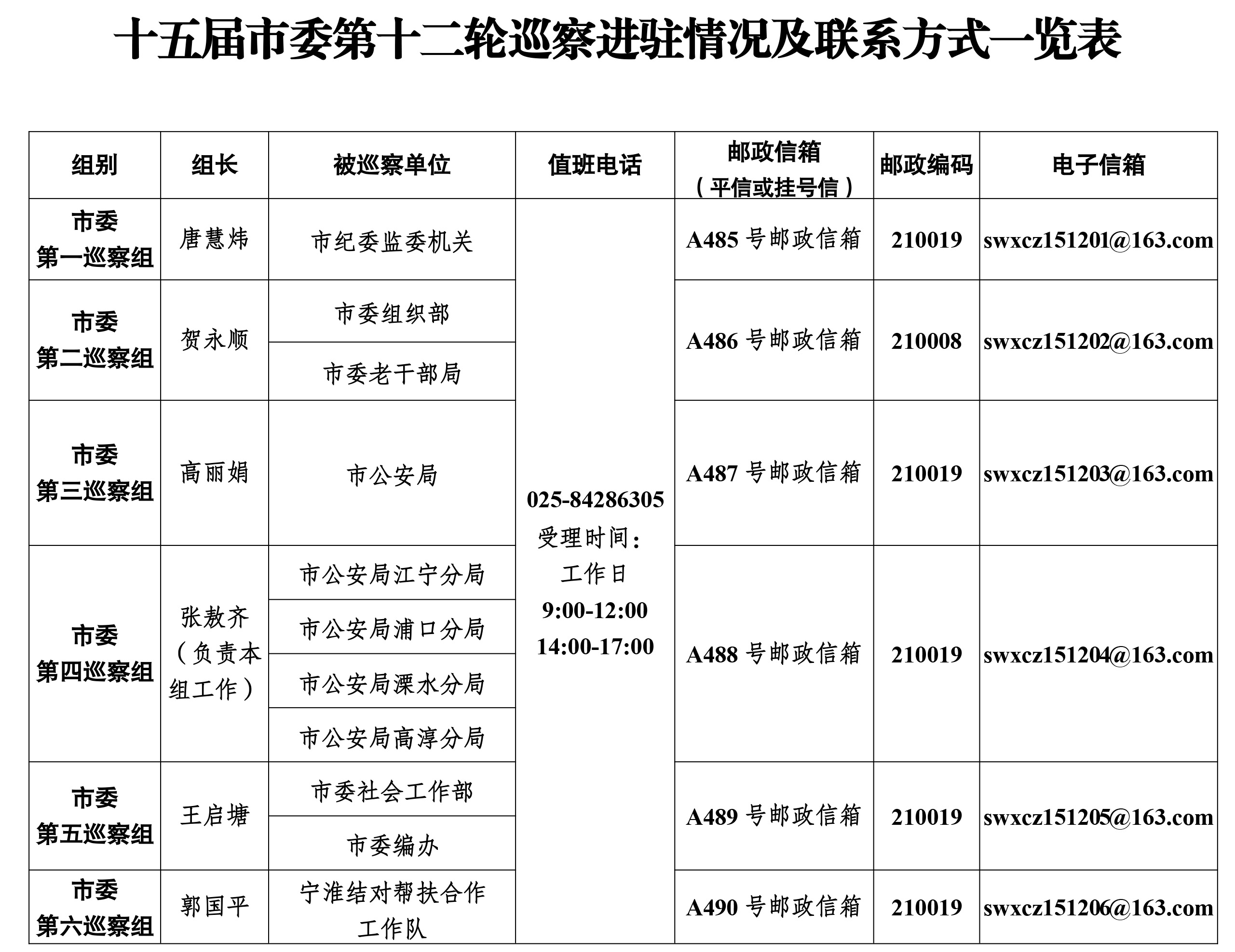 根据市委统一部署,截至3月30日,十五届市委第十二轮巡察完成进驻工作。市委巡察组将对市纪委监委机关、市委组织部、市委社会工作部、市委编办、市委老干部局、市公安局及相关分局党委、宁淮结对帮扶合作工作队党组织开展巡察。