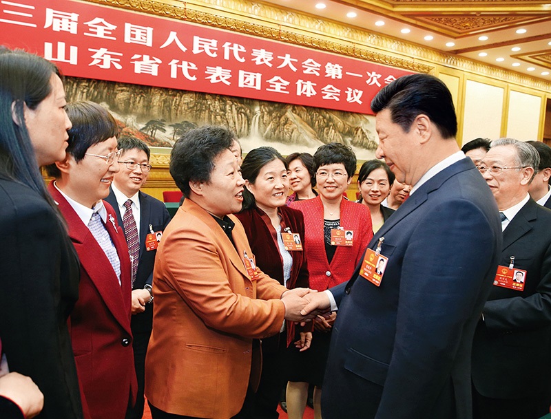 2018年3月8日,中共中央总书记、国家主席、中央军委主席习近平参加十三届全国人大一次会议山东代表团的审议。在“三八”国际劳动妇女节到来之际,习近平代表党中央,向参加全国两会的女代表、女委员、女工作人员,向全国各族各界妇女同胞,致以节日的祝贺和诚挚的祝福。这是习近平同女代表亲切交谈。 新华社记者 姚大伟/摄