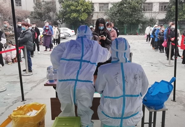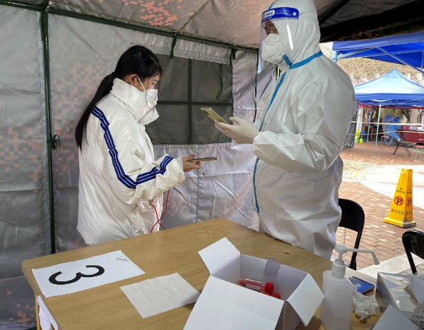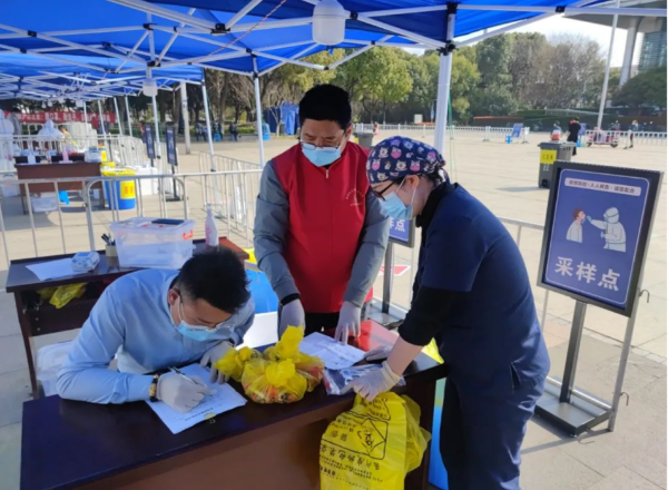 ▲南京市纪委监委组织志愿者,支援社区开展核酸检测和卡点管控等志愿服务。图为志愿者协助医务人员开展核酸检测工作。