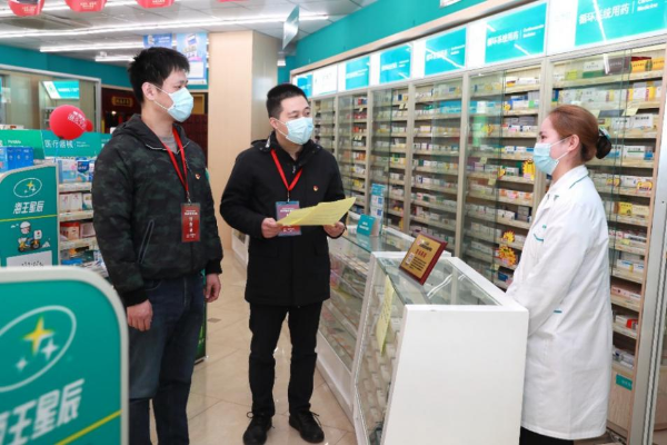 ▲无锡市纪委监委成立10个疫情防控专项督查组,组织纪检监察干部深入重点场所精准开展监督检查。图为督查组到药店了解相关情况。