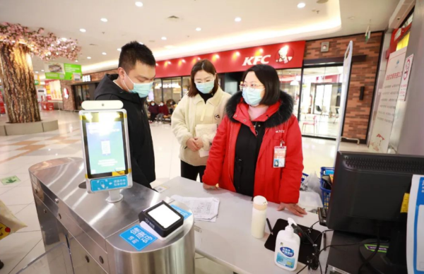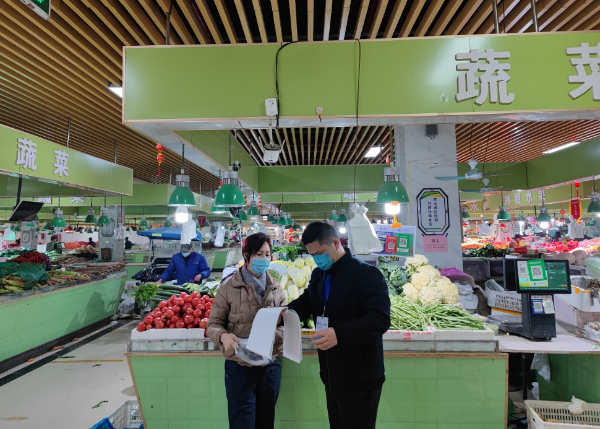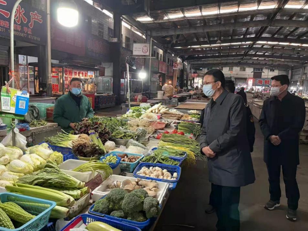 ▲徐州市纪委监委工作人员在蔬菜市场检查是否安排专人值守入口,有无落实入场测温、查“两码”、查验48小时内核酸证明等疫情防控措施。
