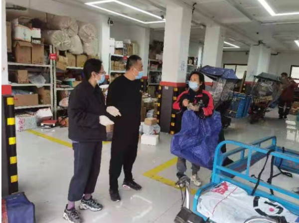 ▲南通市纪委监委工作人员查看快递物流点消毒消杀、人员核酸检测、防疫物资配备等情况。