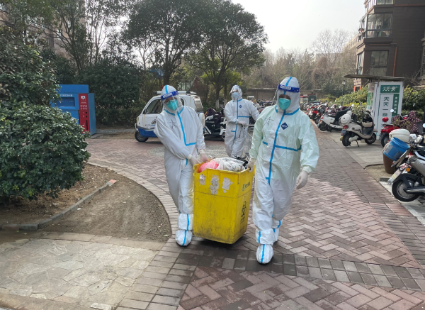 ▲连云港市纪委监委党员志愿者先锋队协助社区做好医疗垃圾和居民生活垃圾清运工作。