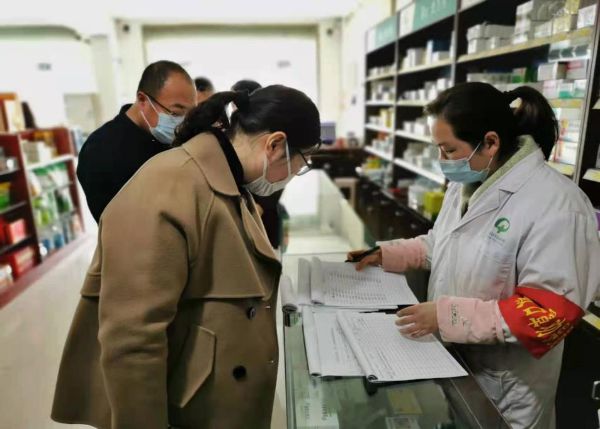 ▲铜山区马坡镇纪委到药店检查防疫物资储备、消毒记录、购买止咳、退烧、抗病毒、抗生素四类药品信息登记情况。