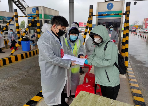 ▲泰州市纪检监察干部在高速卡口对途经风险地区的人员进行信息登记。