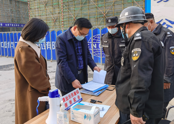 ▲沭阳县纪委监委对建筑工地“两码”查验、场所消毒、人员登记等防控措施是否到位进行检查。