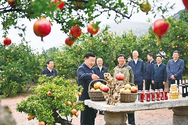 2023年9月24日,中共中央总书记、国家主席、中央军委主席习近平在浙江考察结束返京途中,来到山东省枣庄市考察。这是习近平在位于峄城区的冠世榴园石榴种植园了解石榴产业发展情况。新华社记者 燕雁 摄