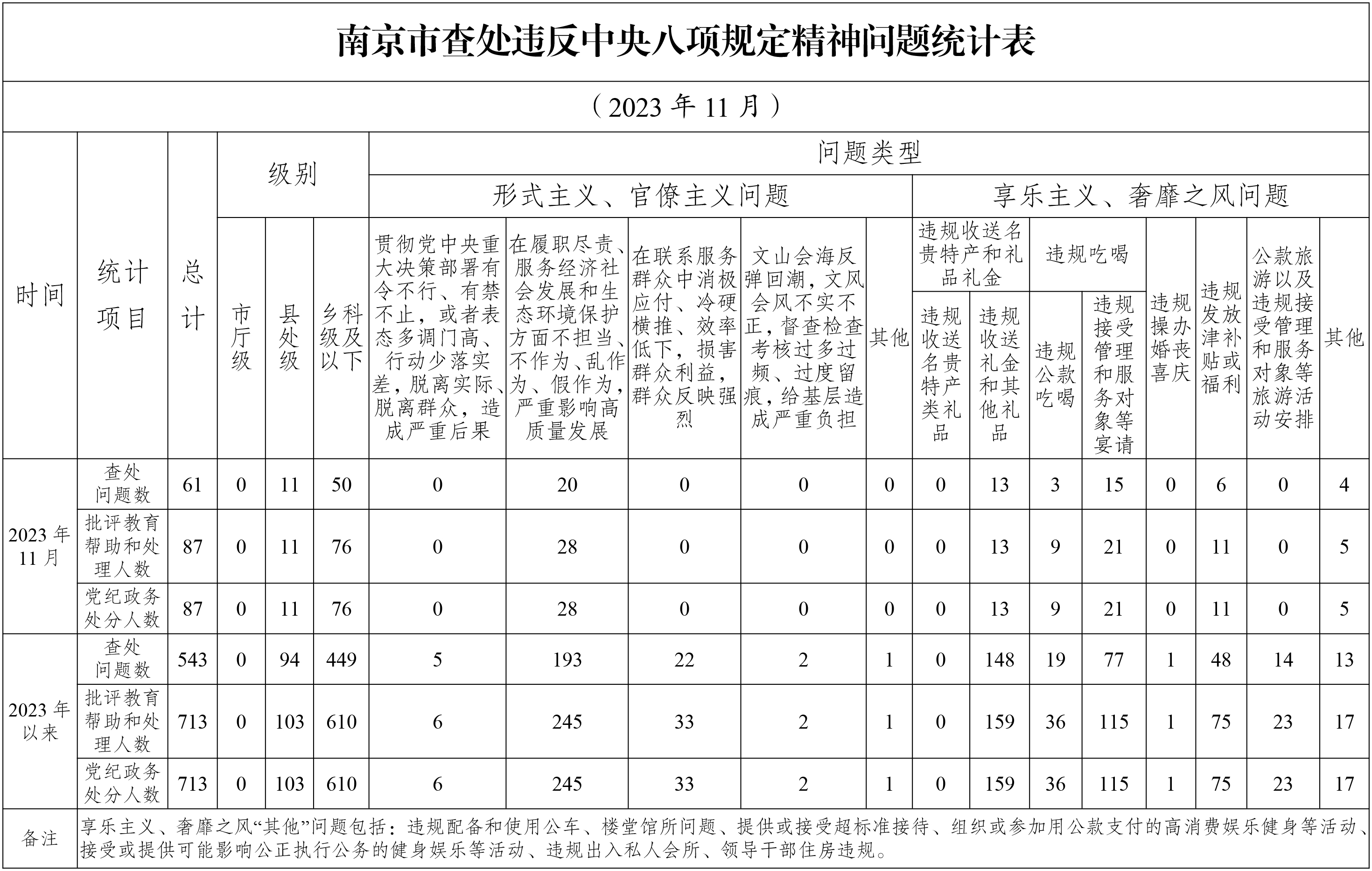 为掌握全市贯彻落实中央八项规定精神情况,南京市纪委监委在各板块、市级机关、市属单位建立了落实中央八项规定精神情况月报制度,定期向社会发布全市查处“四风”问题情况,持续释放落实中央八项规定精神越往后盯得越紧、执纪越严的强烈信号。2023年以来,截至11月30日,全市查处违反中央八项规定精神问题情况如下。