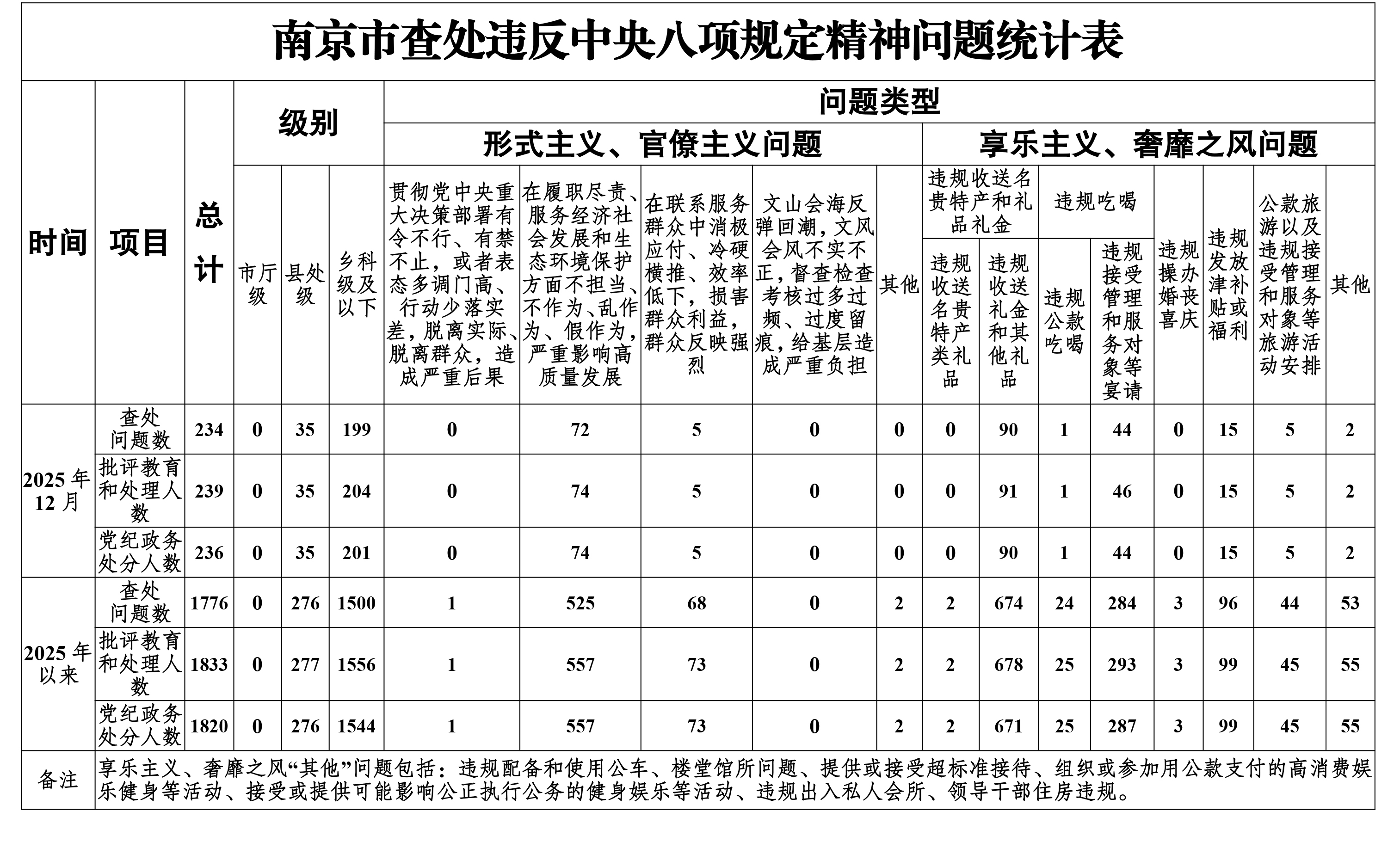 2025年12月南京市查处违反中央八项规定精神问题234起