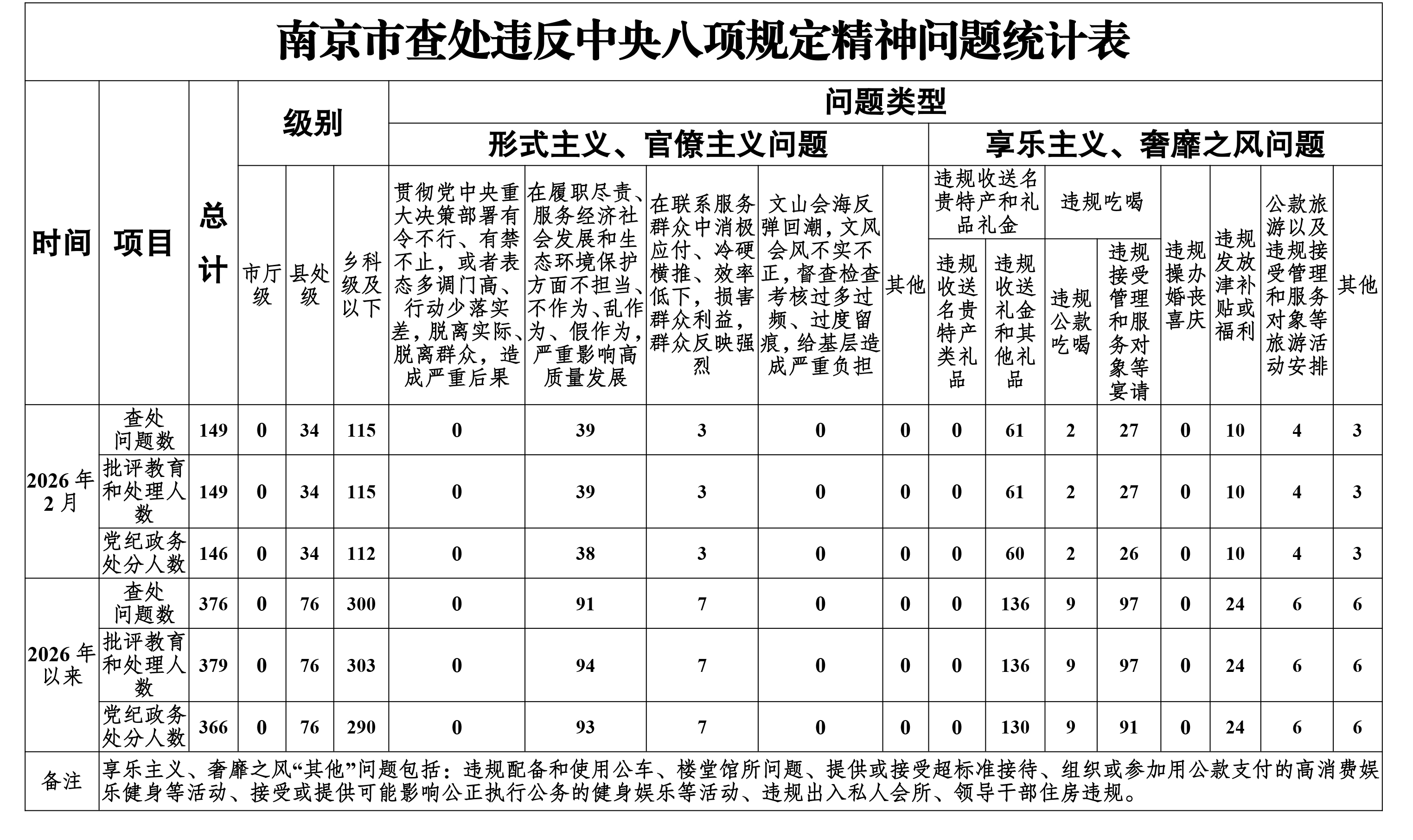 2026年2月南京市查处违反中央八项规定精神问题149起
