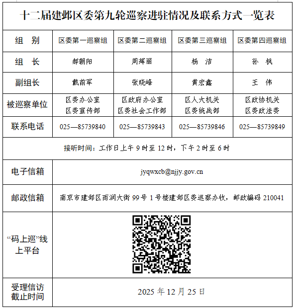 据悉,各区委巡察组将在被巡察单位现场工作2个月左右。巡察期间,设置巡察意见箱,开通信访举报专用邮政信箱、电子邮箱、联系电话、“码上巡”线上平台,方便群众反映相关情况。根据《中国共产党巡视工作条例》《关于市县党委建立巡察制度的意见》和省委、市委、区委关于巡视巡察工作的相关规定,巡察组主要受理涉及被巡察单位领导班子及其成员、其他区管干部以及下一级主要负责人、相关重点岗位干部(含已离退休、已调离)的问题反映,重点是关于违反政治纪律、组织纪律、廉洁纪律、群众纪律、工作纪律、生活纪律等方面的举报和反映。其他不属于巡察受理范围的信访问题,将按规定转交有关部门处理。巡察组受理信访时间截止到2025年12月25日。