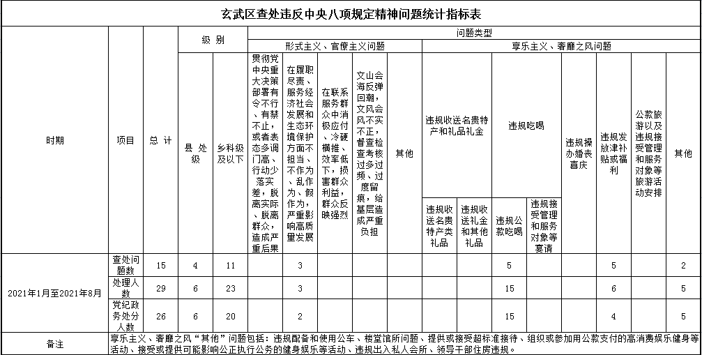 玄武区坚持执行落实中央八项规定精神情况通报制度,定期通报查处“四风”问题情况,持续释放落实中央八项规定精神越往后盯得越紧、执纪越严的强烈信号。2021年以来,截至8月31日,全区共查处违反中央八项规定精神问题15起29人,具体情况如下。