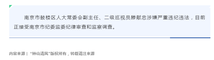 南京市鼓楼区人大常委会副主任、二级巡视员滕献忠接受纪律审查和监察调查