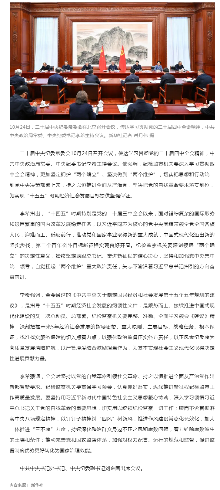 李希主持召开中央纪委常委会会议 传达学习贯彻党的二十届四中全会精神