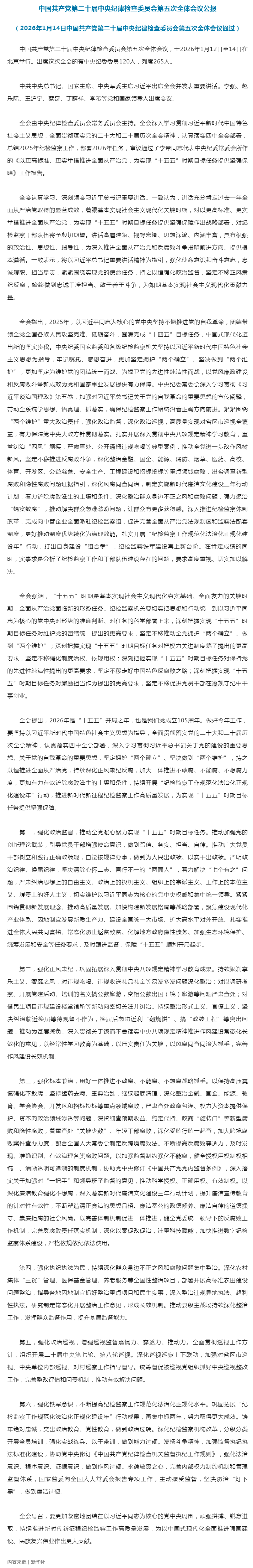 中国共产党第二十届中央纪律检查委员会第五次全体会议公报