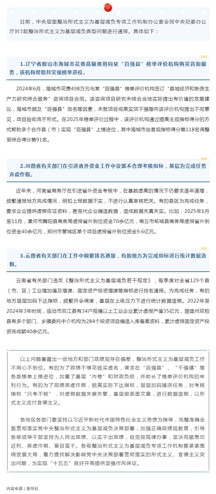 中央层面整治形式主义为基层减负专项工作机制办公室 中央纪委办公厅公开通报3起整治形式主义为基层减负典型问题