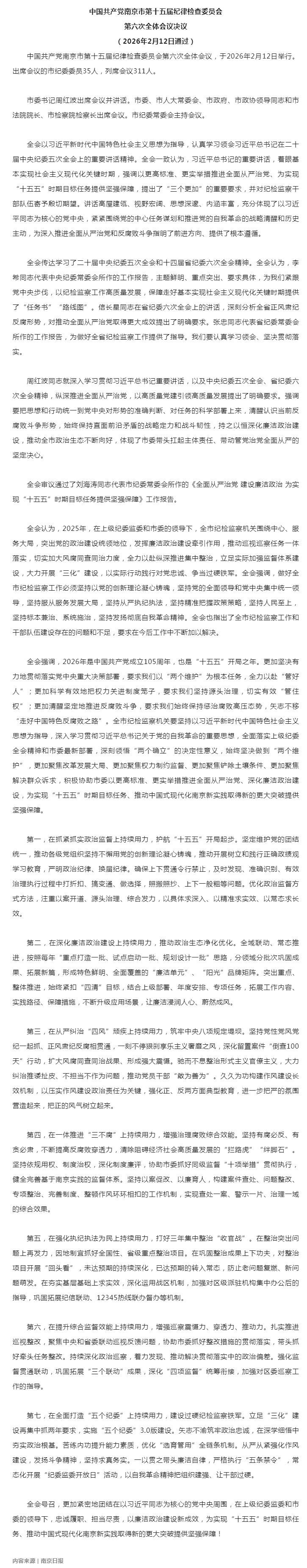 中国共产党南京市第十五届纪律检查委员会第六次全体会议决议