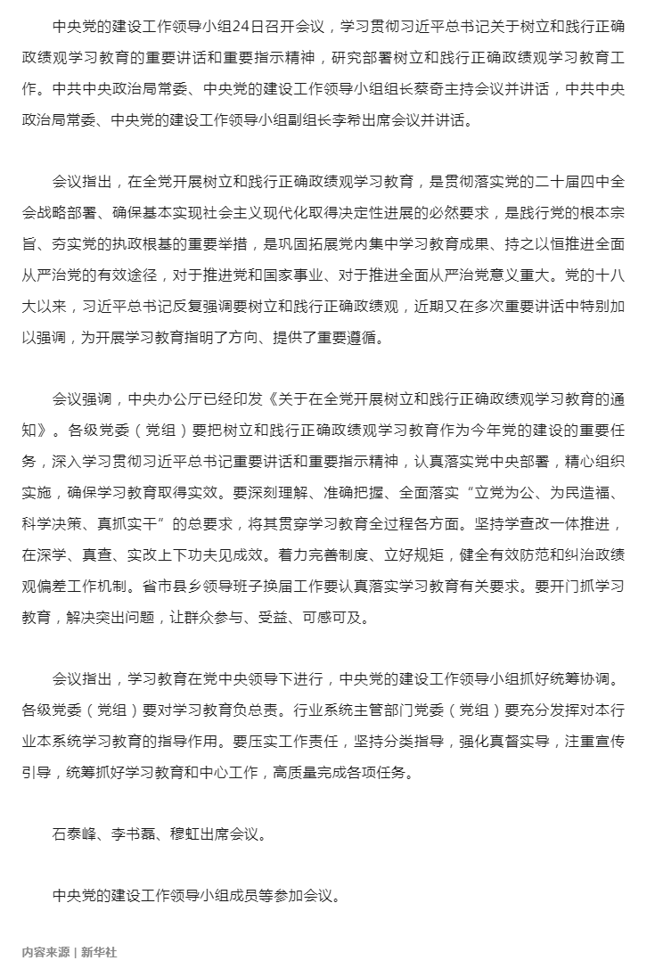 中央党的建设工作领导小组召开会议 研究部署树立和践行正确政绩观学习教育工作