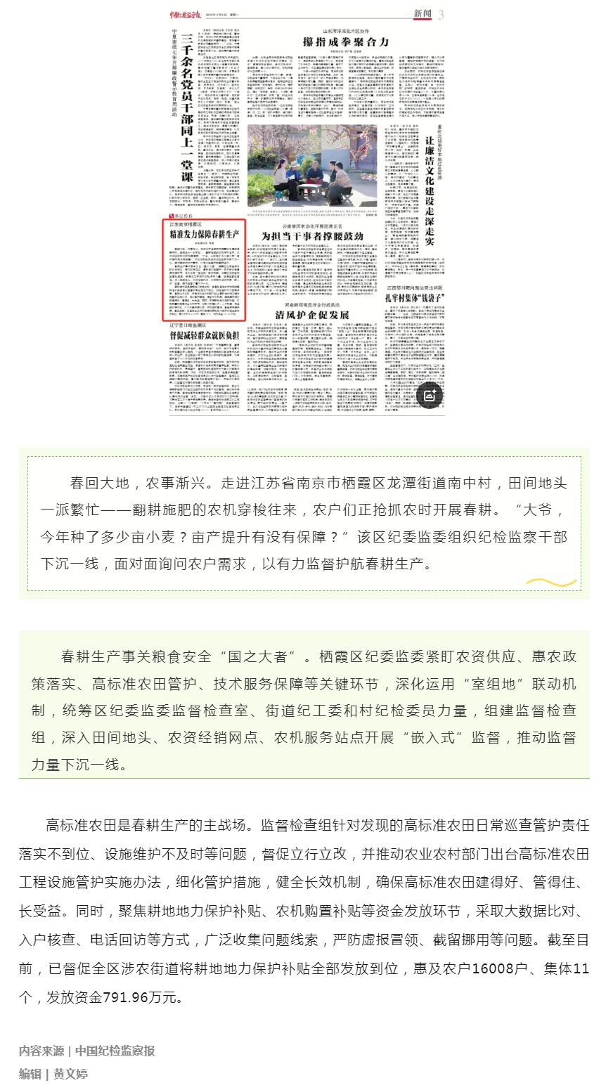 中国纪检监察报刊稿:南京栖霞区精准发力保障春耕生产